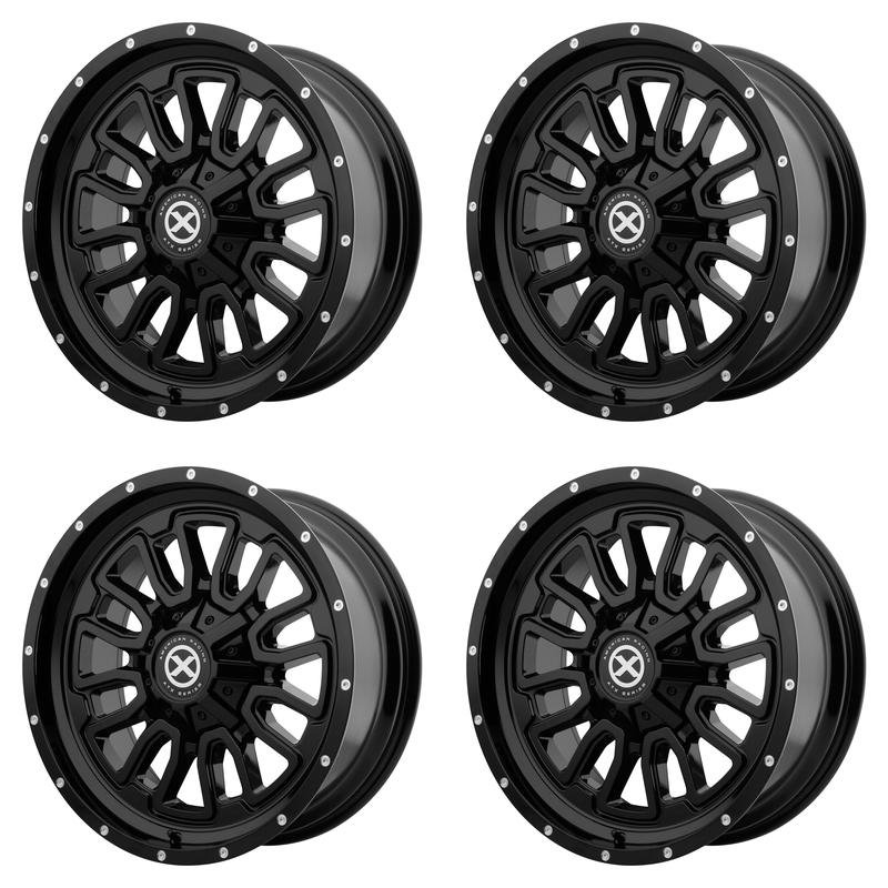 4x ATX Series (by American Racing) AO405 Trex Gloss Black Milled Front/Rear Dually Wheels 10x11.25 / 10x285.75 24.5x8.25 +144 -168